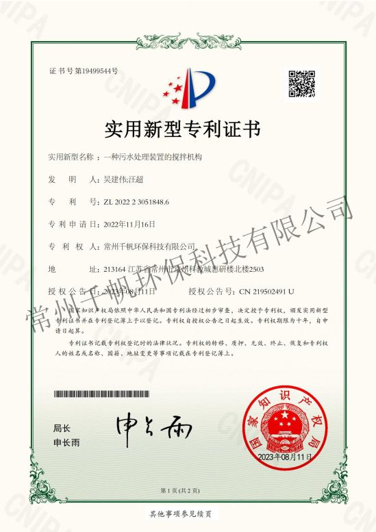 實(shí)用新型專利證書 一種污水處理裝置的攪拌機(jī)構(gòu)
